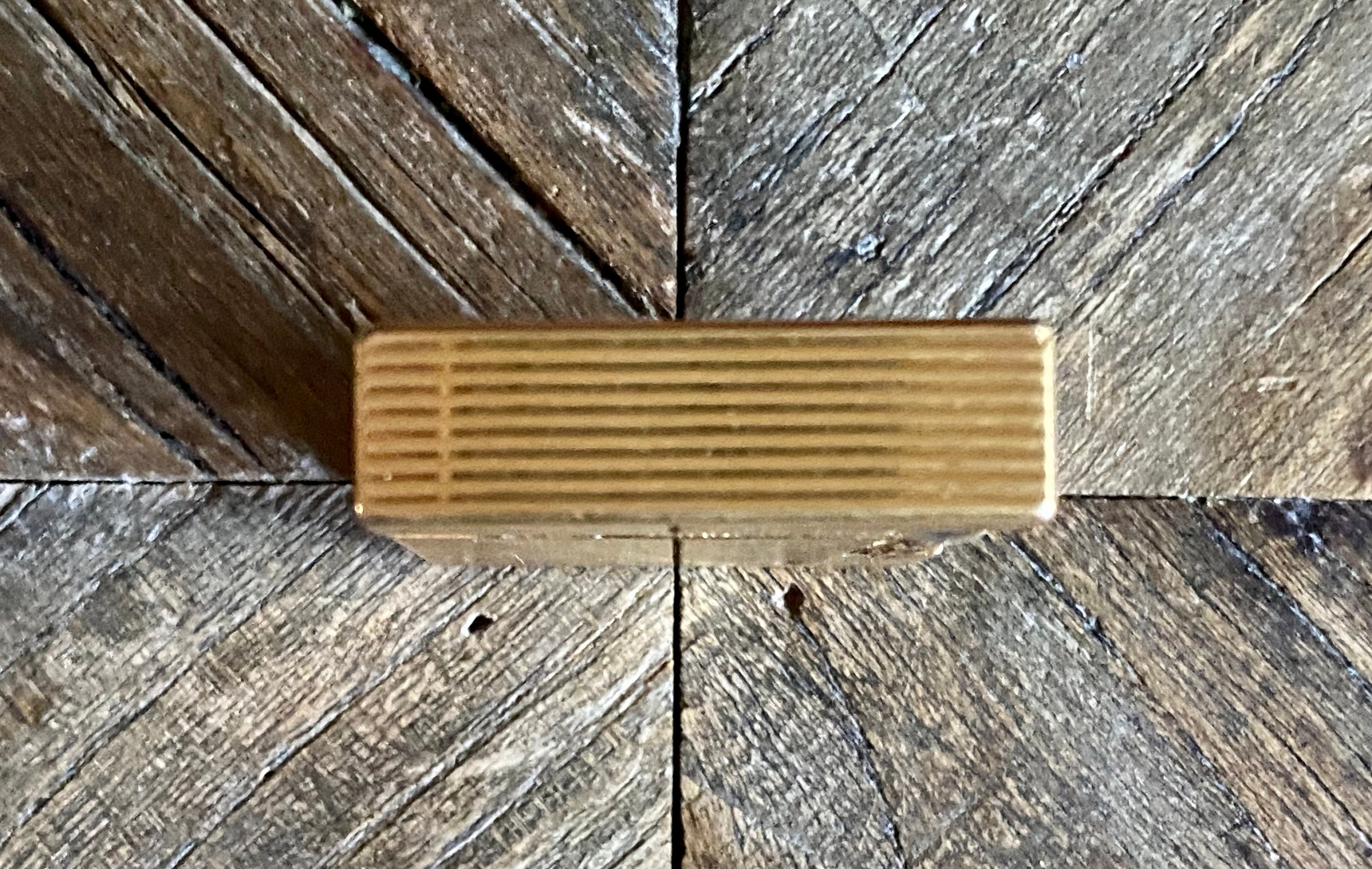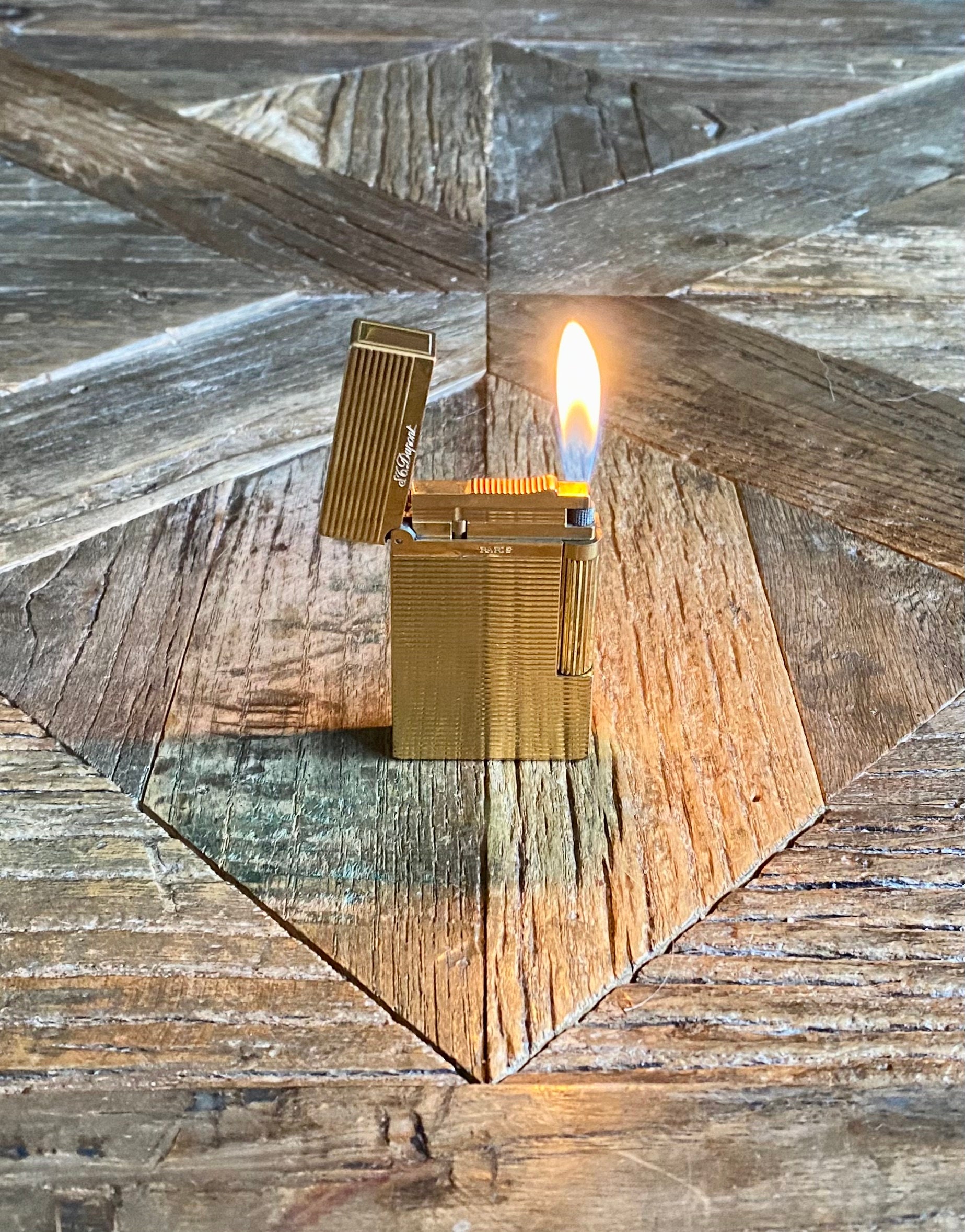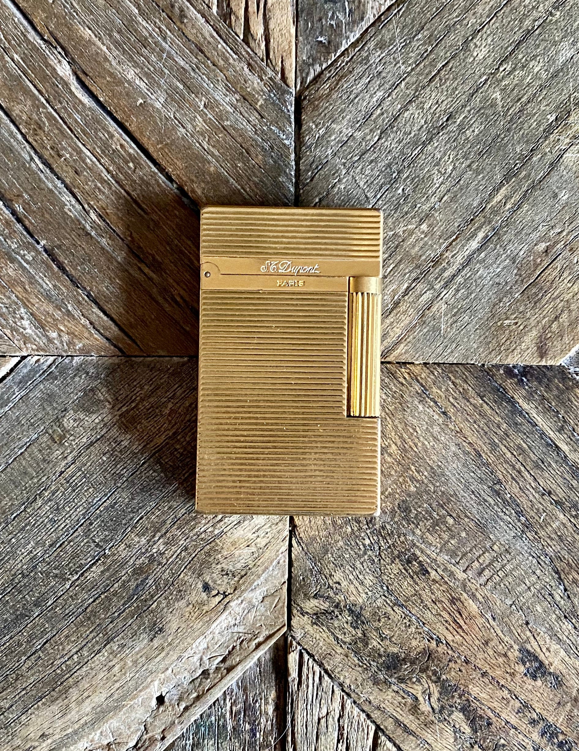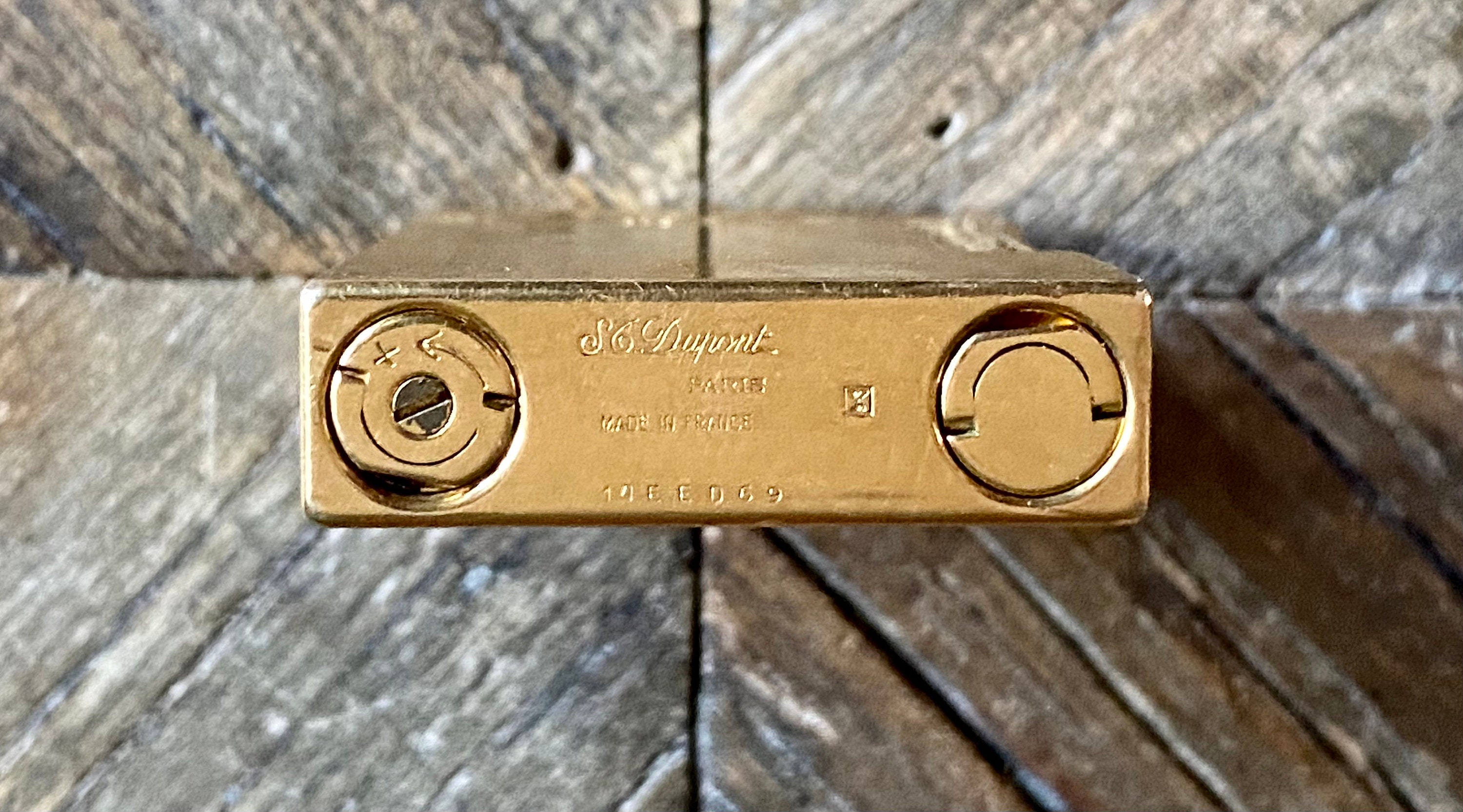 Description and origin: S. T. Dupont lighter, Line 2 - Horizontal-line design, gold-lated. Serial number: 14EED69. Made in France